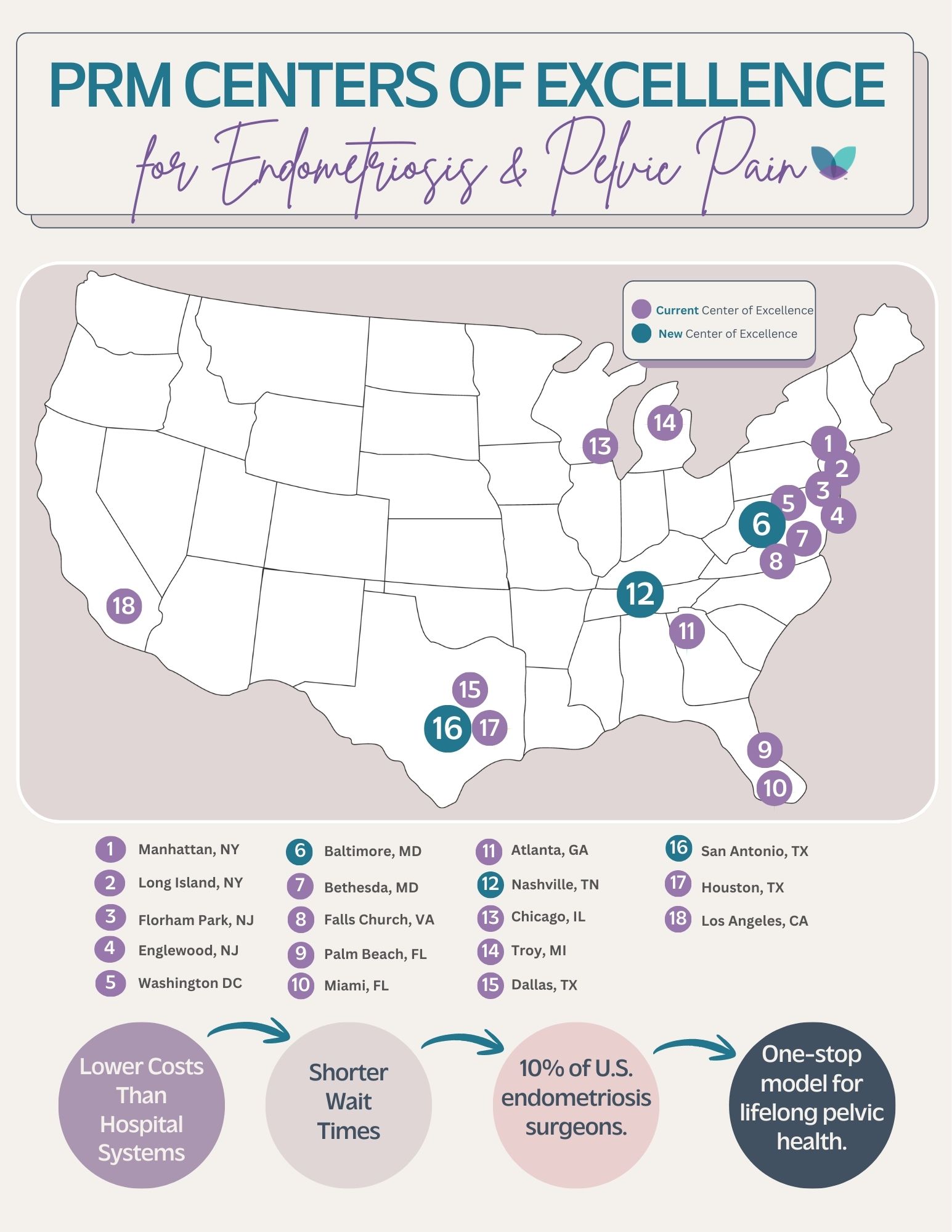 West Palm Beach, FL, March 04, 2026 (GLOBE NEWSWIRE) -- Pelvic Rehabilitation Medicine (PRM), a national leader in Endometriosis and pelvic pain care and a leading advocate for women whose pain has too often been dismissed, today announced the expansion of its Endometriosis Centers of Excellence (COE) into San Antonio, TX; Nashville, TN; and Baltimore, MD. The expansion significantly increases access to specialized, lifetime care for a condition as common as asthma and diabetes, but which continues to be underdiagnosed and undertreated across South Texas, Middle Tennessee, and the Mid-Atlantic.