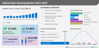 NEW YORK, Feb. 23, 2023 /PRNewswire/ -- The ride sharing market size is forecast to increase by USD 86.33 billion from 2022 to 2027, at a CAGR of 17.45%, according to a recent market study by Technavio. The report includes historic market data from 2017 to 2021. In 2017, the market was valued at USD 48.64 billion. The growth of the market will be driven by the increase in vehicle ownership cost, increasing traffic congestion, and advances in navigation technologies. Charts & data tables about market and segment sizes for a historic period of five (2017-2021) years have been covered in this report. Download The Sample Report